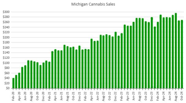 Michigan cannabis sales fell from a year ago in September, and rose sequentially 0.6% in October. At $268.8 million, sales last month were up 2.2% from last year, according to the Cannabis Regulatory Agency’s monthly statistical report.